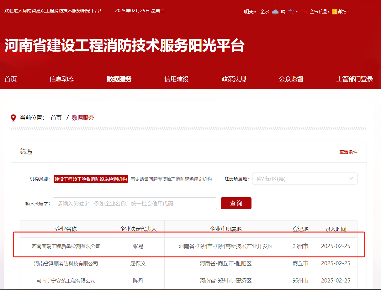 熱烈祝賀河南固瑞工程質(zhì)量檢測有限公司入冊河南省建設(shè)工程消防技術(shù)服務(wù)陽光平臺?。?!